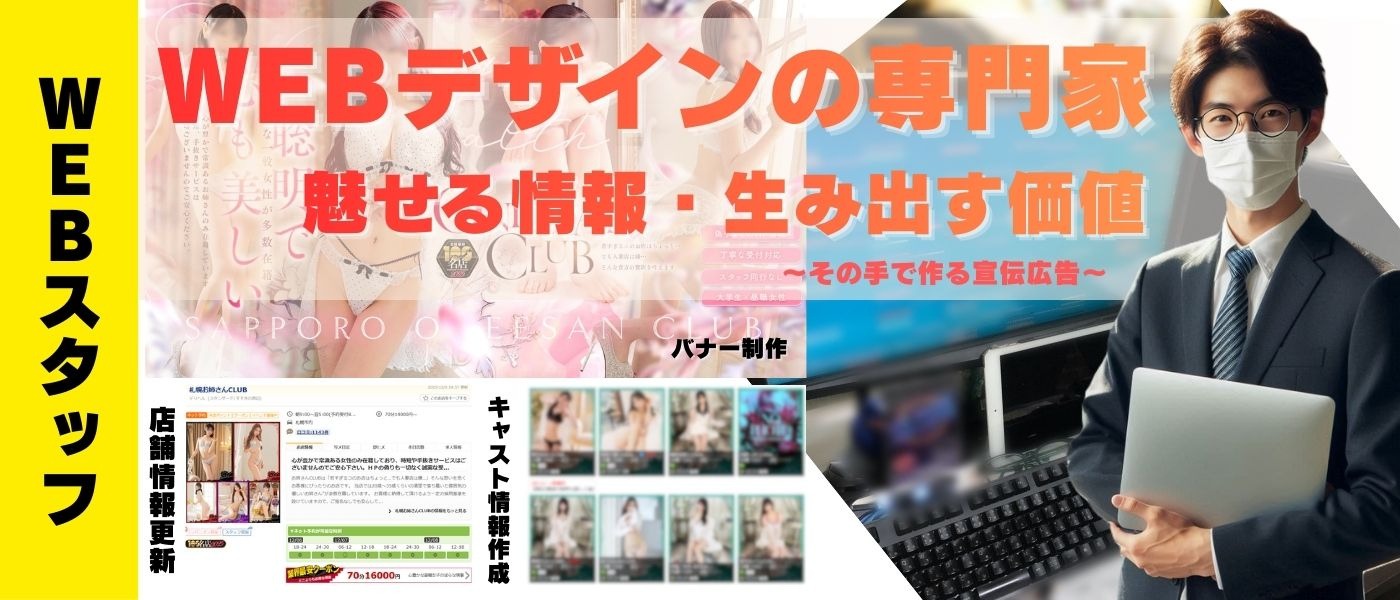 当社では以下の部署でスタッフを募集中①店舗スタッフ(デリヘル/出張エステ:出張型) 勤務場所:すすきのビル内事務所 主な業務:店舗運営関連業務、PC業務、送迎、MT、企画立案 等②店舗スタッフ(ソープ/ヘルス:店舗型) 勤務場所:すすきの各店(お姉さんLABO,お姉さんLABO-艶-,お姉さんSelect) 主な業務:店舗運営関連業務、接客受付、備品管理、清掃 等)③オペレーター(デリヘル/出張エステ:出張型) 勤務場所:すすきのビル内事務所 主な業務:電話受付、配車指示、データ入力④WEBスタッフ(デリヘル/出張エステ/ソープ/ヘルス) 勤務場所:すすきの内専用事務所 主な業務:店舗情報更新、イベント作成、キャスト情報作成、バナー作成⑤送迎ドライバー(デリヘル/出張エステ/ソープ/ヘルス) 勤務場所:すすきの及び札幌市内、札幌市内近郊(車内待機、すすきの発) 主な業務:キャスト送迎(運転のみ)----------------------------------------------------送迎ドライバーはアルバイトでの採用となります。店舗スタッフ(店舗型)に関しては接客スタッフとしてアルバイト勤務も可能です。それ以外は社員での採用となります。いずれも経験は不要となります。年齢不問、お得意な業務や挑戦してみたいこと、目的に合わせてご応募ください。採用枠についてはお問合せ時にご確認ください。特にアルバイト勤務についてはシフト調整により空き枠がない時間帯も状況によってございます。まずはお気軽にご連絡ください。